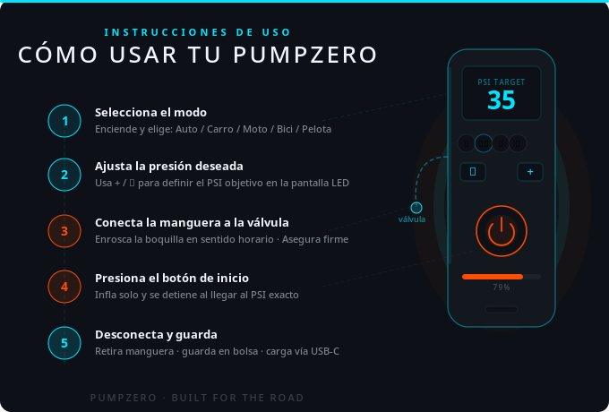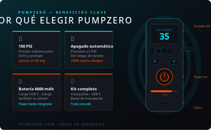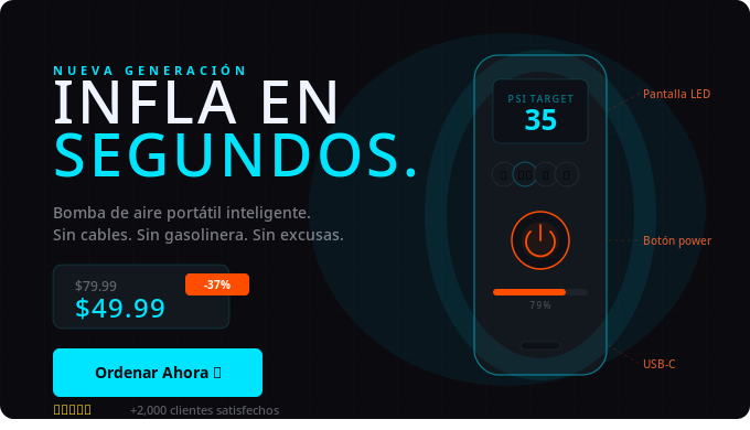 Infla tus neumáticos en segundos con nuestra tecnología de inflado rápido. La precisión digital garantiza la presión exacta que necesitas para un rendimiento óptimo y mayor durabilidad de tus llantas.