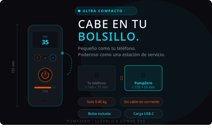 Diseño compacto y ligero que cabe en cualquier maletero. Perfecto para llevar en viajes, camping o emergencias en carretera.